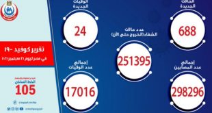 القاهرة-سانا أعلنت وزارة الصحة والسكان المصرية تسجيل 688 إصابة جديدة و24 وفاة بفيروس كورونا خلال الساعات الـ 24 الماضية. وأوضح متحدث باسم الوزارة أن 703 متعافين من الفيروس خرجوا من المستشفيات أمس بعد تلقيهم الرعاية الطبية اللازمة وتمام شفائهم وفقاً …