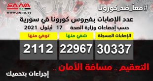 دمشق-سانا أعلنت وزارة الصحة اليوم تسجيل 184 إصابة جديدة بفيروس كورونا في سورية وشفاء 42 حالة ووفاة 8 حالات من الإصابات المسجلة بالفيروس. وأوضحت الوزارة في بيان تلقت سانا نسخة منه أن عدد الإصابات المسجلة في سورية بلغ حتى الآن …