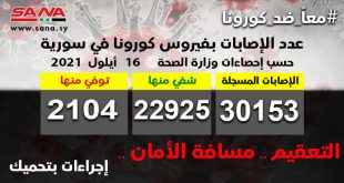 دمشق-سانا أعلنت وزارة الصحة اليوم تسجيل 179 إصابة جديدة بفيروس كورونا في سورية وشفاء 45 حالة ووفاة 7 حالات من الإصابات المسجلة بالفيروس. وأوضحت الوزارة في بيان تلقت “سانا” نسخة منه أن عدد الإصابات المسجلة في سورية بلغ حتى الآن …
