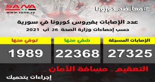دمشق-سانا أعلنت وزارة الصحة اليوم تسجيل 104 إصابات جديدة بفيروس كورونا في سورية وشفاء 20 حالة ووفاة 4 من الإصابات المسجلة بالفيروس. وأوضحت الوزارة في بيان تلقت سانا نسخة منه أن عدد الإصابات المسجلة في سورية بلغ حتى الآن 27325 …