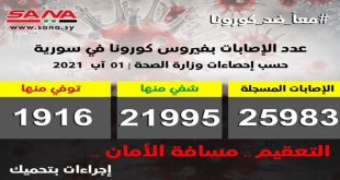 دمشق-سانا أعلنت وزارة الصحة اليوم تسجيل 20 إصابة جديدة بفيروس كورونا في سورية وشفاء 8 حالات ووفاة حالتين من الإصابات المسجلة بالفيروس. وأوضحت الوزارة في بيان تلقت سانا نسخة منه أن عدد الإصابات المسجلة في سورية بلغ حتى الآن 25983 …