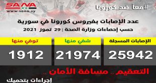 دمشق-سانا أعلنت وزارة الصحة اليوم تسجيل 12 إصابة جديدة بفيروس كورونا في سورية وشفاء 5 حالات ووفاة حالة واحدة من الإصابات المسجلة بالفيروس. وأوضحت الوزارة في بيان تلقت سانا نسخة منه أن عدد الإصابات المسجلة في سورية بلغ حتى الآن …