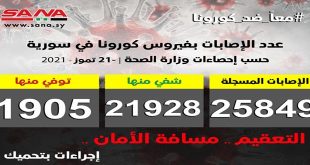 دمشق-سانا أعلنت وزارة الصحة اليوم تسجيل 4 إصابات جديدة بفيروس كورونا في سورية وشفاء 4 حالات مع عدم تسجيل أي حالة وفاة من الإصابات المسجلة بالفيروس. وأوضحت الوزارة في بيان تلقت سانا نسخة منه أن عدد الإصابات المسجلة في سورية …