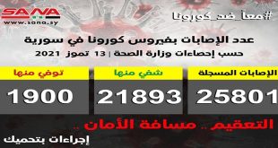 دمشق-سانا أعلنت وزارة الصحة اليوم تسجيل 6 إصابات جديدة بفيروس كورونا في سورية وشفاء 4 حالات ووفاة حالة واحدة من الإصابات المسجلة بالفيروس. وأوضحت الوزارة في بيان تلقت سانا نسخة منه أن عدد الإصابات المسجلة في سورية بلغ حتى الآن …
