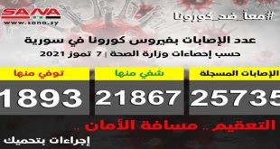 دمشق- سانا أعلنت وزارة الصحة اليوم تسجيل 23 إصابة جديدة بفيروس كورونا في سورية وشفاء 5 حالات ووفاة حالتين من الإصابات المسجلة بالفيروس. وأوضحت الوزارة في بيان تلقت سانا نسخة منه أن عدد الإصابات المسجلة في سورية بلغ حتى الآن …
