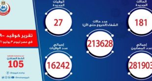 القاهرة-سانا أعلنت وزارة الصحة والسكان المصرية تسجيل 27 حالة وفاة و181 حالة إصابة جديدة بفيروس كورونا المستجد خلال الأربع وعشرين ساعة الماضية. وأوضح الدكتور خالد مجاهد المتحدث الرسمي للوزارة أن إجمالي العدد الذي تم تسجيله في مصر بفيروس كورونا المستجد …