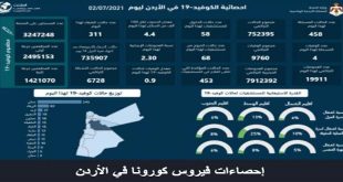 عمان-سانا سجل الأردن 4 وفيات و458 إصابة جديدة بفيروس كورونا خلال الساعات الأربع والعشرين الماضية. وذكرت وزارة الصحة الأردنية في بيان اليوم “إن إجمالي الإصابات بكورونا في البلاد ارتفع إلى 752395 والوفيات إلى 9760 حالة”. وسجل الأردن أمس 533 إصابة …