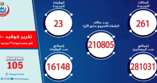 القاهرة-سانا أعلنت وزارة الصحة والسكان المصرية تسجيل 23 وفاة و261 إصابة جديدة بفيروس كورونا المستجد خلال الساعات الـ 24 الماضية. وأوضح خالد مجاهد مساعد وزيرة الصحة والسكان للإعلام والتوعية والمتحدث الرسمي باسم الوزارة في تصريح له أن 323 متعافياً من …