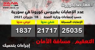 دمشق-سانا أعلنت وزارة الصحة اليوم تسجيل 44 إصابة جديدة بفيروس كورونا في سورية وشفاء 8 حالات ووفاة 5 من الإصابات المسجلة بالفيروس. وأوضحت الوزارة في بيان تلقت سانا نسخة منه أن عدد الإصابات المسجلة في سورية بلغ حتى الآن 25035 …
