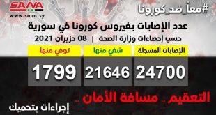 دمشق-سانا أعلنت وزارة الصحة اليوم تسجيل 20 إصابة جديدة بفيروس كورونا في سورية وشفاء 6 حالات ووفاة 3 من الإصابات المسجلة بالفيروس. وأوضحت الوزارة في بيان تلقت سانا نسخة منه أن عدد الإصابات المسجلة في سورية بلغ حتى الآن 24700 …