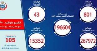 القاهرة-سانا أعلنت وزارة الصحة والسكان المصرية تسجيل 801 إصابة جديدة و43 حالة وفاة بفيروس كورونا خلال الساعات الأربع والعشرين الماضية. وأوضح المتحدث الرسمي باسم الوزارة الدكتور خالد مجاهد في بيان إن إجمالي الإصابات بفيروس كورونا في البلاد وصل لغاية الآن …
