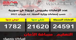 دمشق-سانا أعلنت وزارة الصحة اليوم تسجيل 32 إصابة جديدة بفيروس كورونا فى سورية وشفاء 6 حالات ووفاة 4 من الإصابات المسجلة بالفيروس. وأوضحت الوزارة في بيان تلقت سانا نسخة منه أن عدد الإصابات المسجلة في سورية بلغ حتى الآن 24591 …