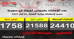 دمشق- سانا أعلنت وزارة الصحة اليوم تسجيل 45 إصابة جديدة بفيروس كورونا في سورية وشفاء 5 حالات ووفاة 4 من الإصابات المسجلة بالفيروس. وأوضحت الوزارة في بيان تلقت سانا نسخة منه أن عدد الإصابات المسجلة في سورية بلغ حتى الآن …