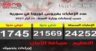 دمشق-سانا أعلنت وزارة الصحة اليوم تسجيل 65 إصابة جديدة بفيروس كورونا في سورية وشفاء 9 حالات ووفاة 5 من الإصابات المسجلة بالفيروس. وأوضحت الوزارة في بيان تلقت سانا نسخة منه أن عدد الإصابات المسجلة في سورية بلغ حتى الآن 24252 شفيت …