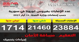 دمشق-سانا أعلنت وزارة الصحة اليوم تسجيل 54 إصابة جديدة بفيروس كورونا في سورية وشفاء 100 حالة ووفاة 4 من الإصابات المسجلة بالفيروس. وأوضحت الوزارة في بيان تلقت سانا نسخة منه أن عدد الإصابات المسجلة في سورية بلغ حتى الآن 23884 …