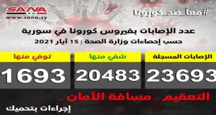 دمشق-سانا أعلنت وزارة الصحة اليوم تسجيل 48 إصابة جديدة بفيروس كورونا في سورية وشفاء 286 حالة ووفاة 5 من الإصابات المسجلة بالفيروس. وأوضحت الوزارة في بيان تلقت سانا نسخة منه أن عدد الإصابات المسجلة في سورية بلغ حتى الآن 23693 …