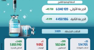 الرياض والكويت-سانا سجلت السعودية اليوم 12 حالة وفاة و927 إصابة جديدة بفيروس كورونا المستجد ما يمثل أقل حصيلة إصابات منذ 18 نيسان الماضي. وأفادت وزارة الصحة السعودية بأن الحصيلة العامة للإصابات المؤكدة بالفيروس في البلاد ارتفعت إلى 431432 حالة فيما …