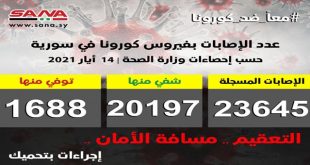 دمشق-سانا أعلنت وزارة الصحة اليوم تسجيل 50 إصابة جديدة بفيروس كورونا في سورية وشفاء 289 حالة ووفاة 6 من الإصابات المسجلة بالفيروس. وأوضحت الوزارة في بيان تلقت سانا نسخة منه أن عدد الإصابات المسجلة في سورية بلغ حتى الآن 23645 …