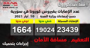 دمشق-سانا أعلنت وزارة الصحة اليوم تسجيل 60 إصابة جديدة بفيروس كورونا في سورية وشفاء 287 حالة ووفاة 7 من الإصابات المسجلة بالفيروس. وأوضحت الوزارة في بيان تلقت سانا نسخة منه أن عدد الإصابات المسجلة في سورية بلغ حتى الأن 23439 …