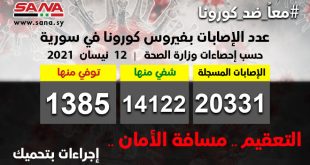 دمشق-سانا أعلنت وزارة الصحة اليوم تسجيل 105 إصابات جديدة بفيروس كورونا في سورية وشفاء 110 حالات ووفاة 7 من الإصابات المسجلة بالفيروس. وأوضحت الوزارة في بيان تلقت سانا نسخة منه أن عدد الإصابات المسجلة في سورية بلغ حتى الآن 20331 …