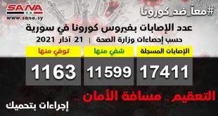 دمشق-سانا قبل عام من اليوم سجلت سورية أول حالة كورونا لفتاة قادمة من الخارج واليوم في حصيلتها الرسمية أكثر من 17 ألفاً و400 حالة و1163 وفاة وخلال سنة مرت البلاد بثلاثة منحنيات تصاعدية للجائحة فيما الإجراءات الوقائية اتخذت مساراً مكثفا …