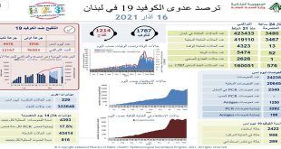 بيروت-سانا سجلت وزارة الصحة اللبنانية 3480 إصابة جديدة و52 وفاة بفيروس كورونا خلال الساعات الأربع والعشرين الماضية. وذكرت الوزارة في تقريرها اليوم أن إجمالي عدد الإصابات ارتفع إلى 423433 والوفيات إلى 5474 حالة. وكانت الوزارة سجلت أمس 42 حالة وفاة …