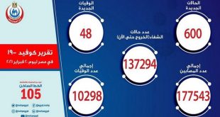 القاهرة-سانا أعلنت وزارة الصحة والسكان في مصر عن تسجيل 48 حالة وفاة جديدة و600 إصابة بفيروس كورونا المستجد. وأوضح الدكتور خالد مجاهد المتحدث الرسمي للوزارة أن إجمالي العدد الذي تم تسجيله في مصر بفيروس كورونا المستجد حتى يوم أمس هو …