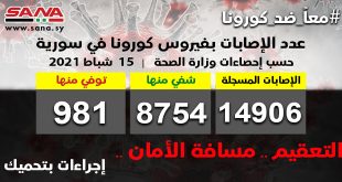 دمشق-سانا أعلنت وزارة الصحة اليوم تسجيل 43 إصابة جديدة بفيروس كورونا في سورية وشفاء 75 حالة ووفاة 3 من الإصابات المسجلة بالفيروس. وأوضحت الوزارة في بيان تلقت سانا نسخة منه أن عدد الإصابات المسجلة في سورية بلغ حتى الآن 14906 …