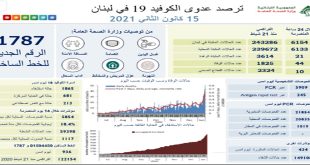 بيروت-سانا أعلنت لبنان اليوم تسجيل 44 وفاة و6154 إصابة جديدة بفيروس كورونا المستجد خلال الساعات الأربع والعشرين الماضية. وأفادت وزارة الصحة العامة اللبنانية في تقريرها اليوم بأن العدد الإجمالي للإصابات ارتفع في البلاد إلى 243286 فيما ارتفع العدد الإجمالي للوفيات …