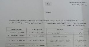 دمشق-سانا أعلنت وزارة التنمية الإدارية اليوم تأجيل مواعيد المقابلات الشفهية للمتسابقين الناجحين في الامتحان المؤتمت ضمن المسابقة المعلن عنها لتعيين عدد من لمواطنين بوظائف من الفئتين الأولى والثانية. وفي بيان للوزارة تلقت سانا نسخة منه ذكرت أن موعد مقابلات الفئة …