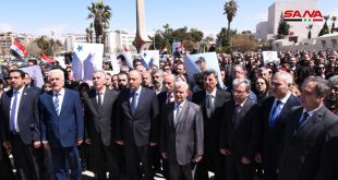 دمشق-سانا نظم حشد من الإعلاميين وقفة تضامنية مع أهلنا في الجولان العربي السوري المحتل في ساحة الأمويين بدمشق اليوم نددوا خلالها بإعلان ترامب حول الجولان المحتل. وقال وزير الإعلام عماد سارة إن هذه الوقفة لا نستطيع أن نسميها وقفة احتجاجية …