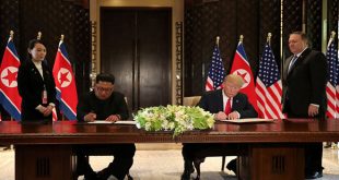 سنغافورة-سانا وقع الرئيس الأمريكي دونالد ترامب ورئيس كوريا الديمقراطية كيم جونغ أون اليوم وثيقة مشتركة شاملة في أعقاب القمة التي جمعت الرئيسين في سنغافورة. ونقلت رويترز عن ترامب قوله بعد توقيع الوثيقة إنه بنى “علاقة خاصة جدا مع رئيس كوريا …