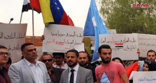 دمشق-سانا نفذت المنظمات الطلابية العربية في سورية اليوم وقفة احتجاجية رفضا واستنكارا للعدوان الثلاثي “الأمريكي البريطاني الفرنسي” على سورية والعدوان السعودي على اليمن وذلك أمام مكتب الأمم المتحدة بحي المزة بدمشق. ودعا المشاركون بالوقفة الأمم المتحدة لتحمل مسؤولياتها الحقوقية والإنسانية …