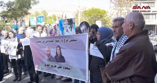 دمشق-سانا نظمت فصائل المقاومة الفلسطينية وقفة تضامنية مع قناة الميادين وتحية لشهداء الإعلام الذين ارتقوا جراء عدوان الاحتلال