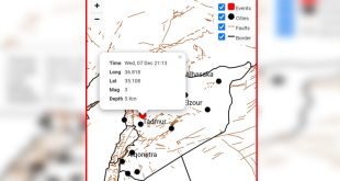 دمشق-سانا ضربت هزة أرضية بقوة 3 درجات على مقياس ريختر مساء اليوم على بعد 7 كم شمال مدينة حماة