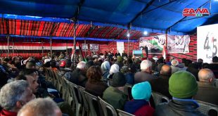 دمشق-سانا دعا المشاركون في المهرجان الجماهيري في مخيم اليرموك بمناسبة يوم الأرض إلى بناء جبهة مقاومة وطنية ضد الاحتلال