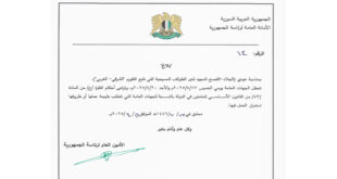 دمشق-سانا أصدرت الأمانة العامة لرئاسة الجمهورية بلاغا بتعطيل الجهات العامة يومي الخميس والأحد القادمين