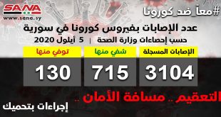 دمشق- سانا أعلنت وزارة الصحة اليوم تسجيل 63 إصابة جديدة وشفاء 17 حالة ووفاة 3 حالات من الإصابات المسجلة بفيروس كورونا في سورية. وأشارت الوزارة في بيان تلقت سانا نسخة منه اليوم إلى أن حصيلة الإصابات المسجلة في سورية حتى …