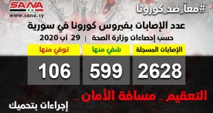 دمشق-سانا أعلنت وزارة الصحة اليوم تسجيل 65 إصابة جديدة وشفاء 15 حالة ووفاة 3 حالات من الإصابات المسجلة بفيروس كورونا في سورية. وأشارت الوزارة في بيان تلقت سانا نسخة منه اليوم إلى أن حصيلة الإصابات المسجلة في سورية حتى الآن …