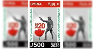 دمشق-سانا أصدرت المؤسسة السورية للبريد طابعاً تذكارياً مع بطاقة بمناسبة الذكرى المئوية لمعركة ميسلون والتي تصادف اليوم. وأوضحت المؤسسة في بيان تلقت سانا نسخة منه أن قيمة الطابع تبلغ 500 ليرة سورية والبطاقة 1500 ليرة وأنه بإمكان هواة جمع الطوابع …