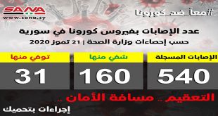 دمشق-سانا أعلنت وزارة الصحة اليوم تسجيل 18 إصابة جديدة بفيروس كورونا في سورية وشفاء 6 حالات ووفاة اثنتين. وأوضحت الوزارة في بيان تلقت سانا نسخة منه أن عدد الإصابات المسجلة في سورية بلغ حتى الآن 540 شفيت منها 160 حالة …