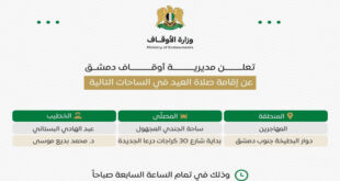 دمشق-سانا حددت وزارة الأوقاف اليوم عدداً من الساحات والأماكن العامة في المحافظات لإقامة صلاة عيد الفطر فيها