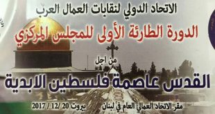 بيروت- سانا أكد المشاركون فى الدورة الطارئة للمجلس المركزي للاتحاد الدولي لنقابات العمال العرب التي اختتمت في بيروت اليوم تحت عنوان القدس عاصمة دولة فلسطين الأبدية أن العدوان الصهيوني الإسرائيلي الأمريكي المستمر على الشعب الفلسطيني والقرار الأمريكي الجائر بتهويد القدس …
