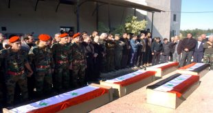 اللاذقية-سانا بأكاليل الورد والغار وبمشاركة رسمية وشعبية تم اليوم تشييع شهداء التفجير الإرهابي الذي وقع قرب الملعب البلدي في مدينة جبلة أمس وتسبب بارتقاء 11 شهيدا وإصابة 35 شخصا بجروح. ونثر المشيعون على الجثامين التي تم تشييعها من مشفى جبلة …