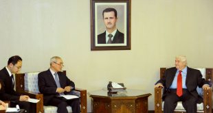 دمشق-سانا استقبل وليد المعلم نائب رئيس مجلس الوزراء وزير الخارجية والمغتربين ظهر اليوم السفير شيه شياو يان المبعوث الصيني الخاص إلى سورية والوفد المرافق. وجرى خلال اللقاء استعراض العلاقات الثنائية بين البلدين الصديقين بالإضافة إلى تطورات الأوضاع في سورية والمنطقة …