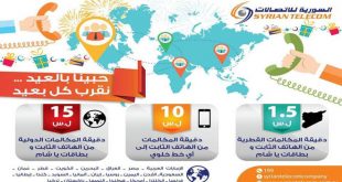 دمشق-سانا أعلنت الشركة السورية للاتصالات عن تخفيضات على الاتصالات الدولية والقطرية والخلوية الصادرة من الهاتف الثابت بمناسبة عيد الفطر السعيد وذلك بدءا من اليوم ولغاية العاشر من تموز الجاري. وتتضمن التخفيضات حسب إعلان الشركة الذي تلقت سانا نسخة منه حسما …