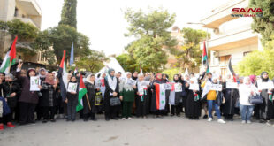 دمشق-سانا نظمت منظمة المرأة التقدمية الفلسطينية اليوم وقفة تضامنية أمام مقر الأمم المتحدة بدمشق، دعماً