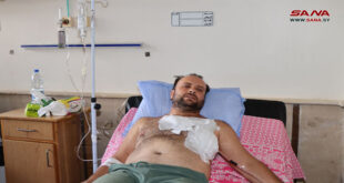 حماة-سانا أصيب مصور الوكالة العربية السورية للأنباء سانا في حماة عزام العمر بشظية في الصدر خلال تغطيته ليل أمس