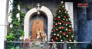 حماة-سانا شهدت مطرانية حماة لطائفة الروم الأرثوذكس في مدينة حماة مساء اليوم احتفالات نصب وإضاءة شجرة الميلاد احتفالاً بقرب