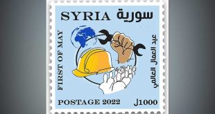 دمشق-سانا أصدرت المؤسسة السورية للبريد طابعاً بريدياً تذكارياً بمناسبة عيد العمال الذي يصادف الأول من أيار من كل عام.